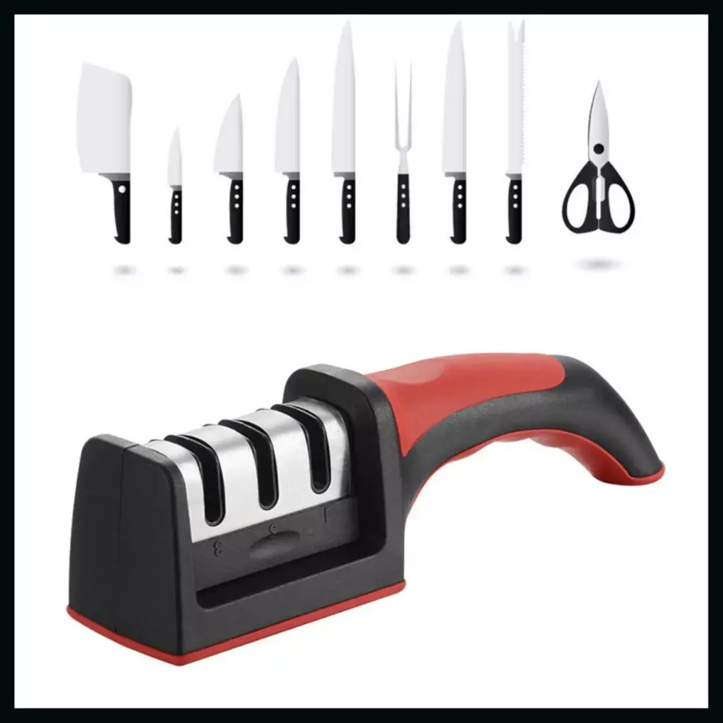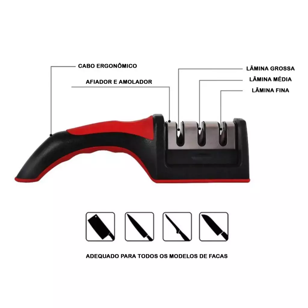 ****Mantenha todas as suas facas afiadas com este afiador de três estágios fácil de usar, ótimo para afiar muitas facas de tamanhos diferentes, com uma alça conveniente para uma pegada segura. Afiador rápido e prático com cabo anatômico e três posições de afiação, suas facas sempre afiadas para seu dia a dia, festas e churrascos.