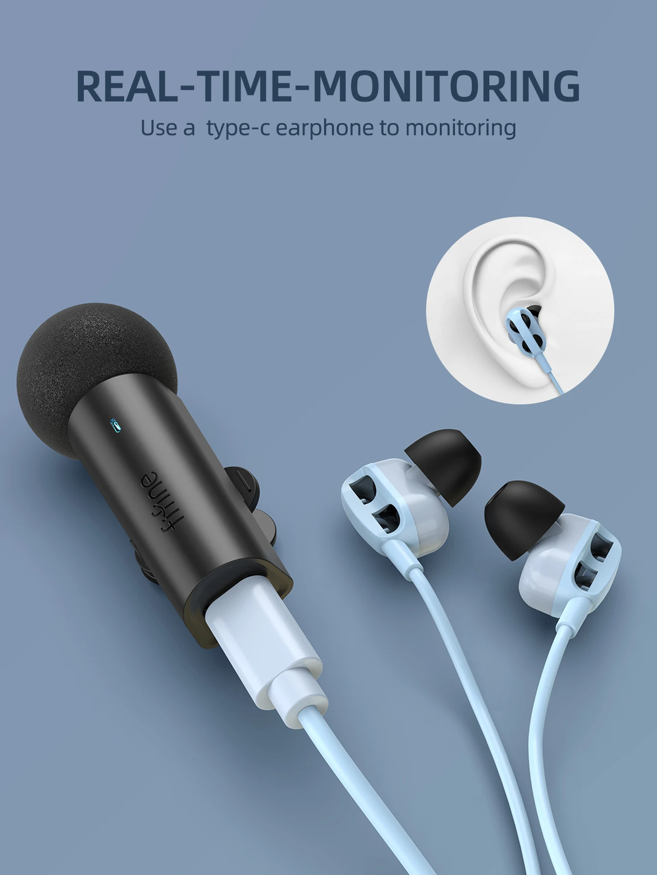 Fone de ouvido tipo- para monitoramento em tempo real (fones de ouvido digitais excluídos). Mudo com um toque, o LED mostra vermelho (mudo)/azul (gravação). Ideal para vlogging, entrevistas, criação de conteúdo com controle total de áudio.