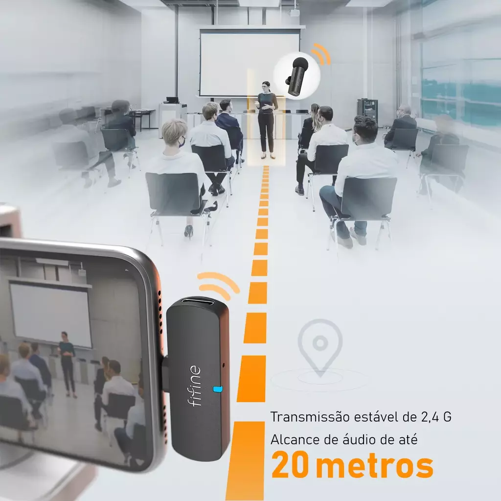 O minúsculo microfone de lapela sem fio M6 adota transmissão de 2,4 GHz, que alcança desempenho de baixa latência, permite transmissão de som rápida e confiável e garante captura de áudio consistente de alta qualidade.