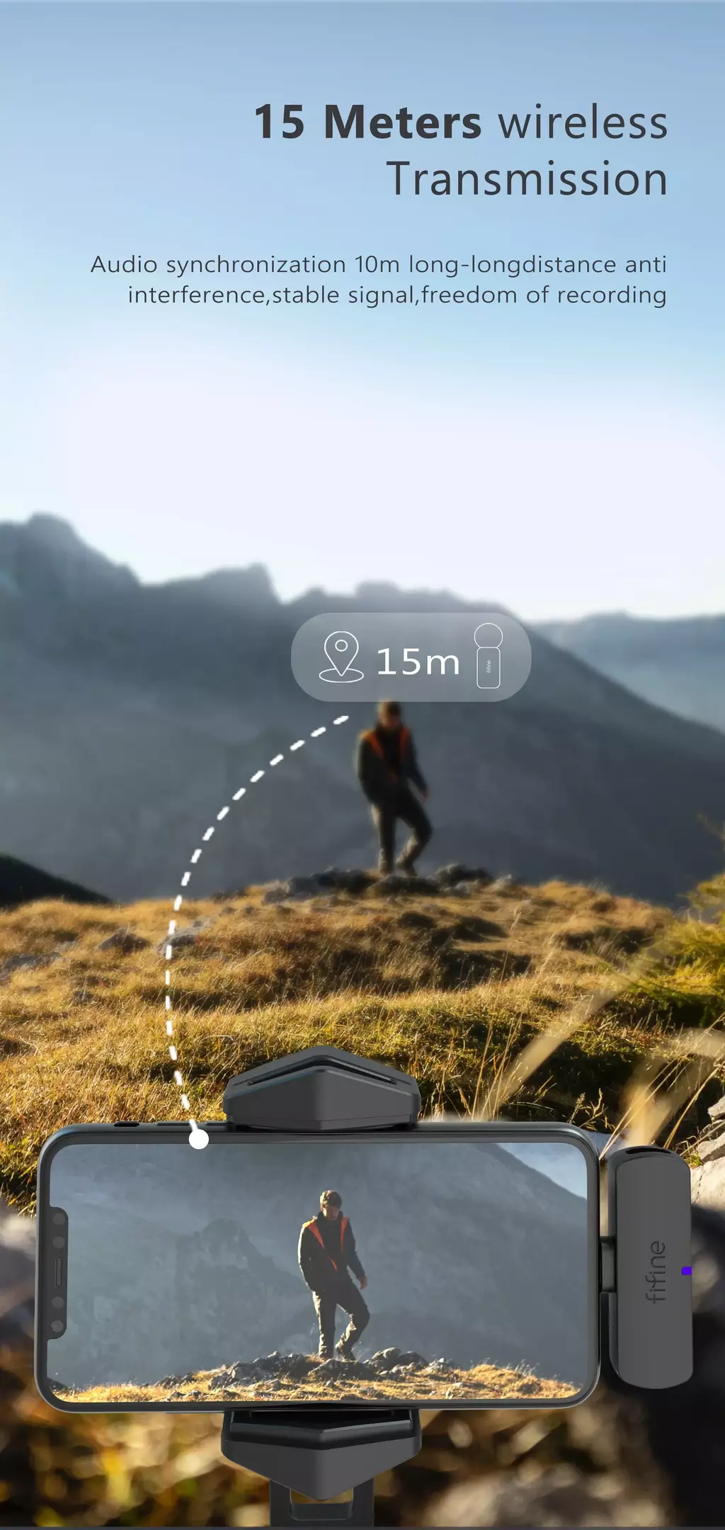 Com um alcance de transmissão sem fio de 15 metros, este microfone pode sincronizar o áudio, resistir a interferências de distância, manter a estabilidade do sinal e gravar livremente em qualquer cenário.