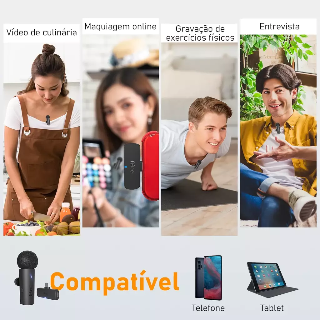 O microfone funciona com USB Type-C, iPads, smartphones e tablets para diversos cenários; seu receptor é alimentado por dispositivos ou USB e possui uma bateria recarregável integrada para uso contínuo.