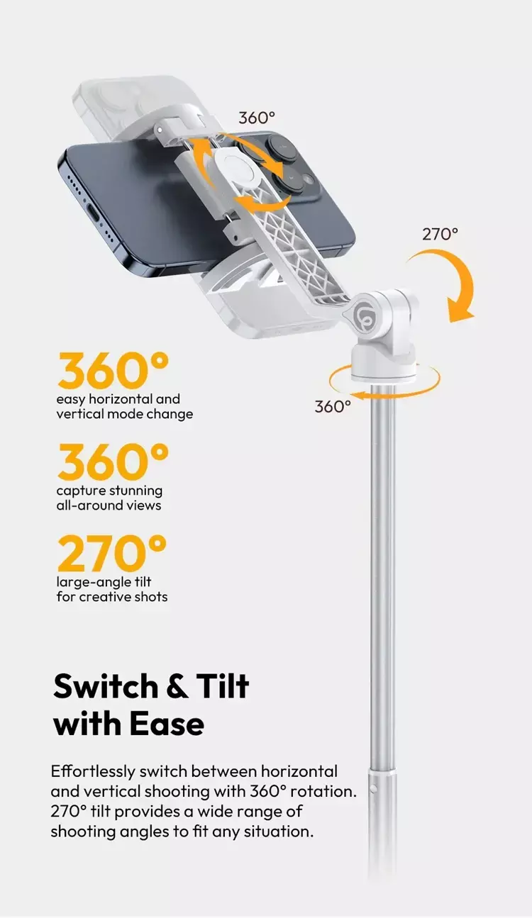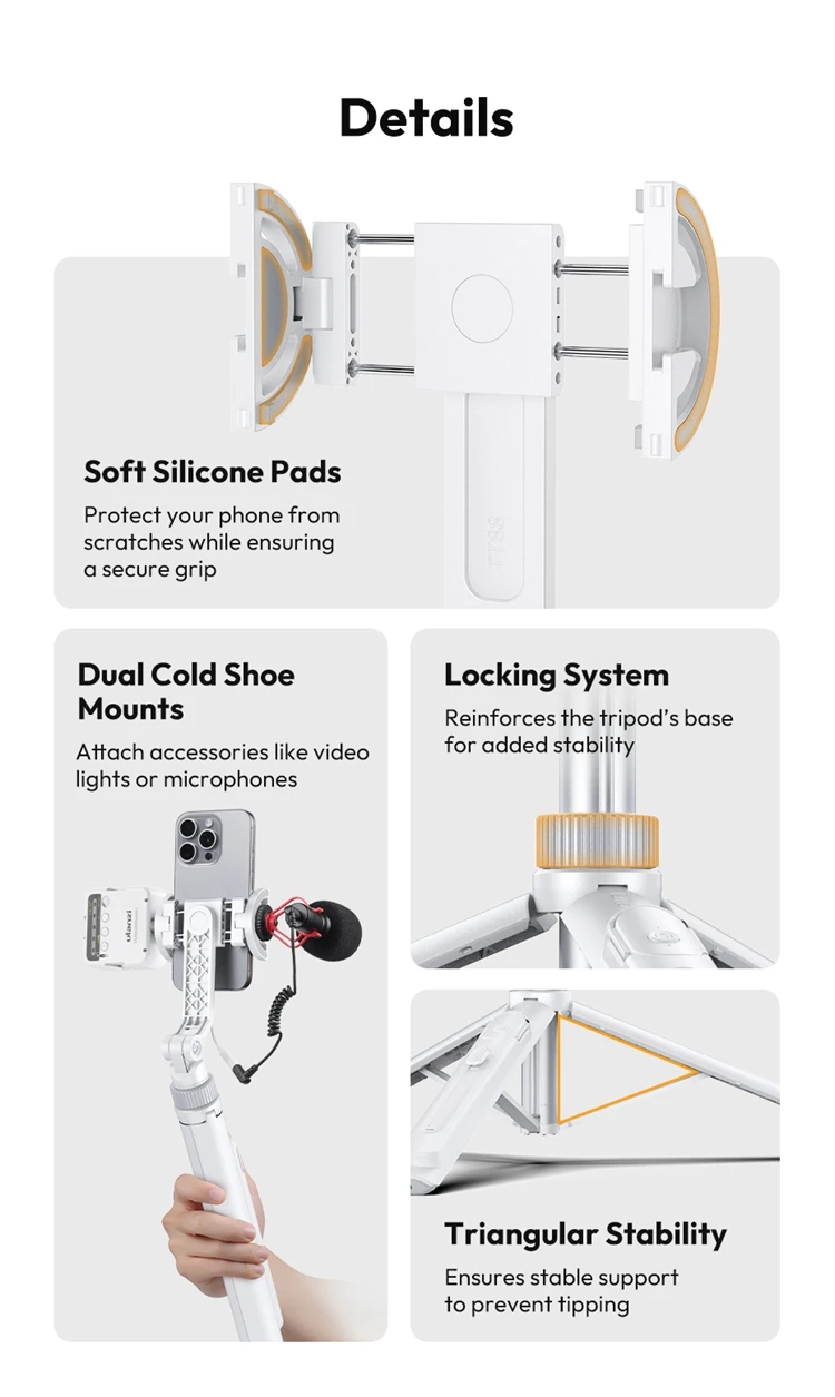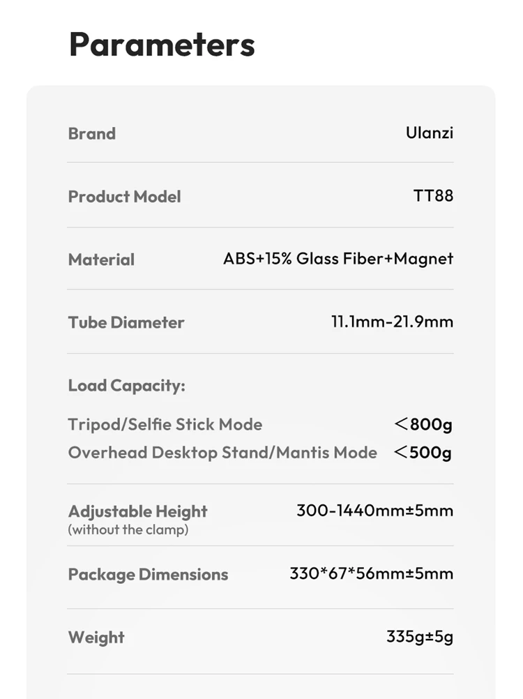 Pesando apenas 335g e com design dobrável, este tripé é ultraportátil e fácil de embalar para aventuras ao ar livre ou viagens.