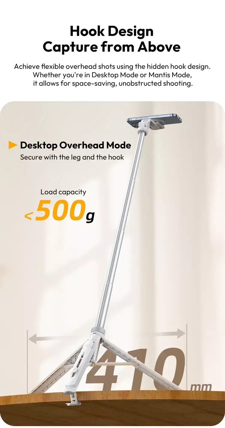 Obtenha fotos aéreas flexíveis usando o design de gancho oculto.Esteja você no modo Desktop ou no modo Mantis, ele permite uma fotografia com economia de espaço e desobstruída.